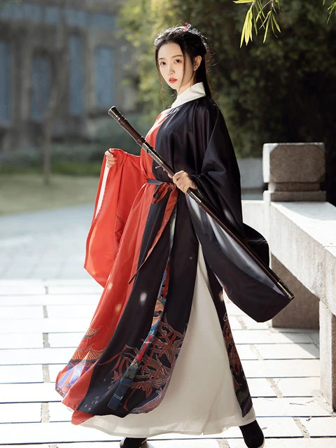 In Hanfu, round-necked robes and Feifu suits are especially suitable to match a sword, and can easily wear the feeling of a swordsman.