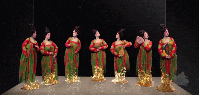 The immortal cranes in the Lotus and Crane Rectangular Hu (莲鹤方壶), took Tang figurine girls to another performance site. The beautiful stage effect, coupled with the wonderful song, we have a more empathetic understanding of this national treasure, the Lotus and Crane Rectangular Hu, and the traditional Chinese culture.