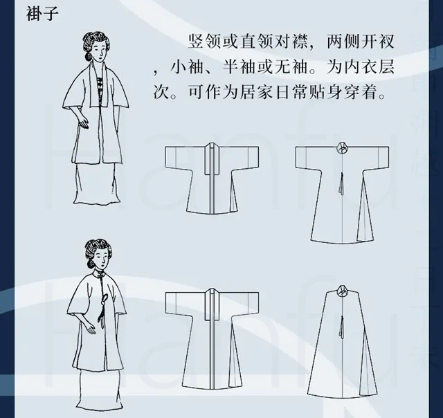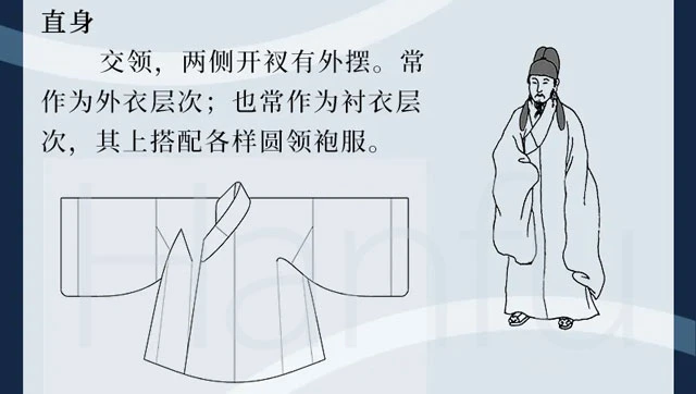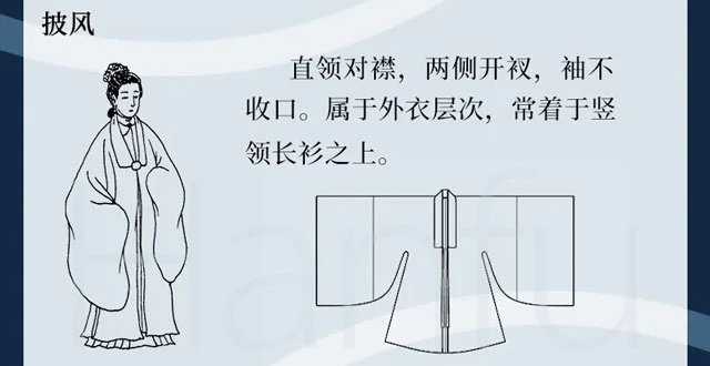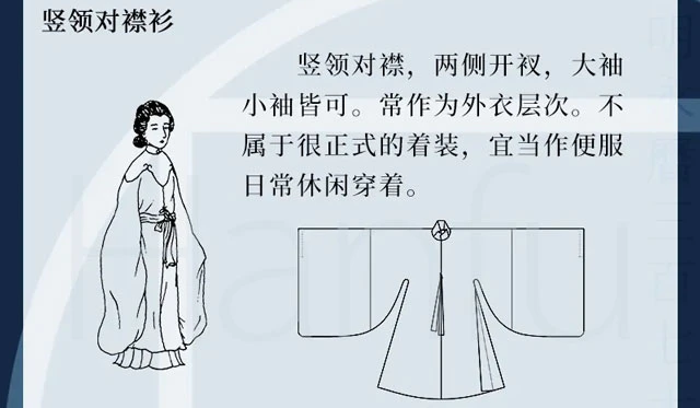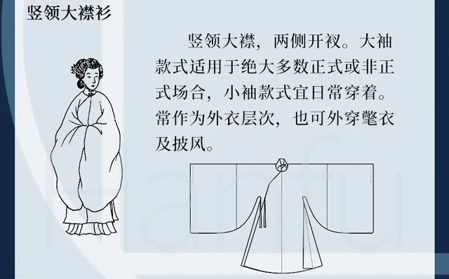 Vertical collar with large lapels and slits on both sides. The large sleeve style is suitable for most formal or informal occasions, while the small sleeve style is suitable for everyday wear. It is often used as an outer layer and can also be worn inside Changyi and Pifeng.
