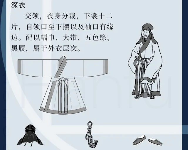Cross collar, the clothes are cut separately, and the lower garment has twelve pieces, the collar to the hem and the cuffs are edged. It is accompanied by a Fujin (幅巾), a large belt, a five-color ribbon, and black shoes, and belongs to the outer clothing level.