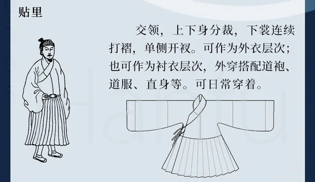 Note: Another style, Yisan (曳撒), has a similar structure to the Tieli, with a cross collar, front separate cut as Mamian style. The two side slits have an outer hem. Can be worn daily.
