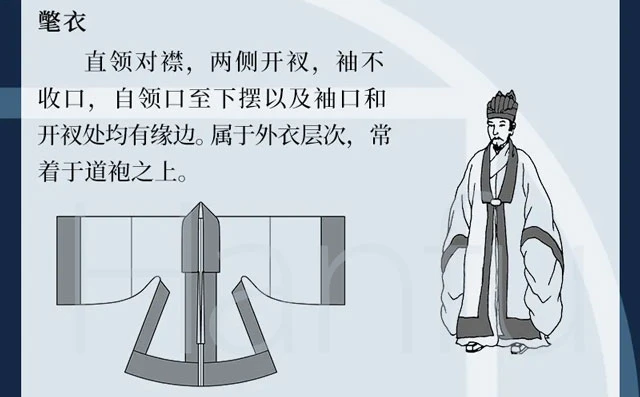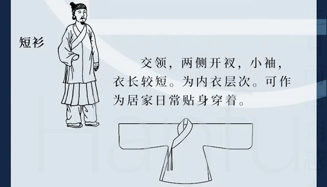 Cross collar, slit on both sides with concealed hem, sleeves are not closed, from the collar to the hem and the cuffs and slit are edged. It is often paired with a Dadai (大带, large belt) and belongs to the outer clothing level.
