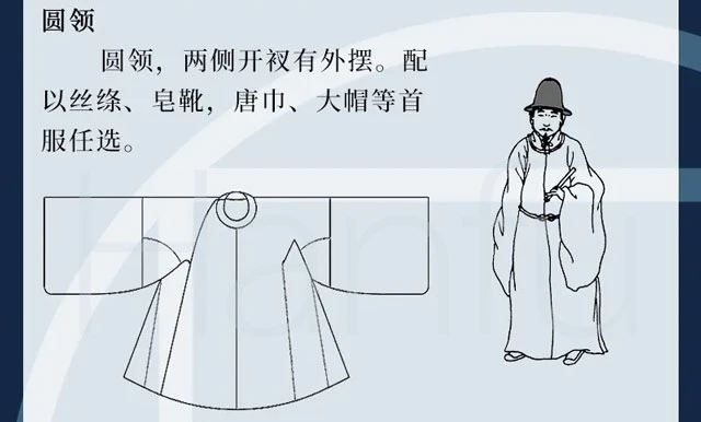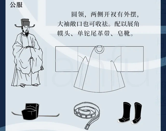 Round collar, slit on both sides with outer hem, large sleeves with open mouth, also can collect sleeves. It is accompanied by a spreading horn Futou (幞头, turban), a single Chawei (䤩尾) leather belt, and Zao Xue (皂靴, a kind of black shoes with high top and thick white sole).