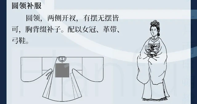 Round collar, slit on both sides, with or without hem, chest, and back decorated with Buzi. Matching with women's crown, leather belt, Gong shoes (弓鞋).