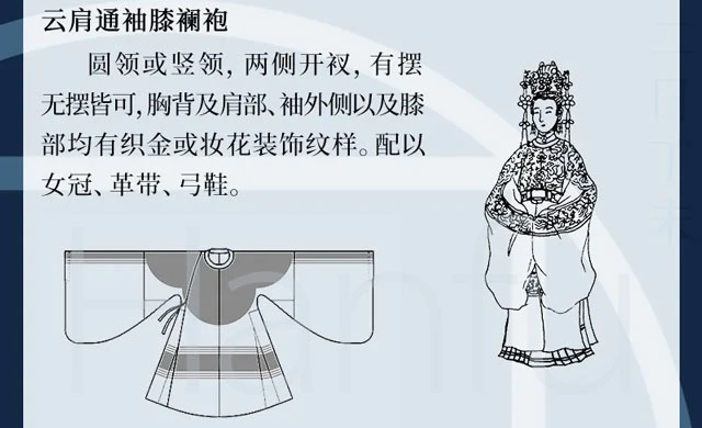 Round or vertical collar, slit on both sides, with or without hem, with decorative patterns of woven gold or Zhuanghua (妆花) on the back of the chest, shoulders, outside of the sleeves, and knees. Matching with women's crown, leather belt, Gong shoes.