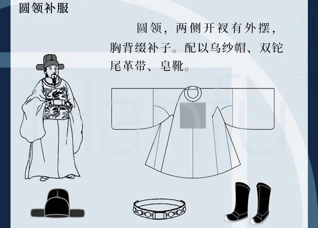Round collar, slit on both sides with outer hem, chest, and back decorated with Buzi (补子). With a Wusha Mao (乌纱帽), double Chawei leather belt, and Zao Xue.