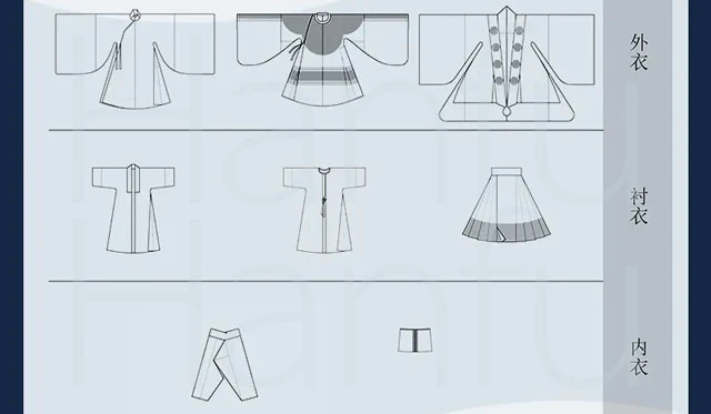 From inside to outside: Ku → Duanshan/Guzi → Pleated Changshan/Tieli → Daopao/Daofu/Zhishen → Pifeng/Changyi.