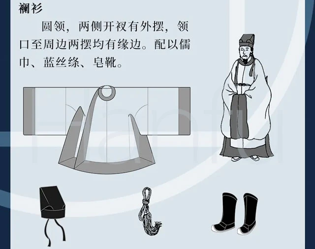 Round collar, slit on both sides with outer hem, collar to the periphery of the two hems are edged. Matching with a Rujin (儒巾, Confucian scarf), blue silk ribbon, Zao Xue.