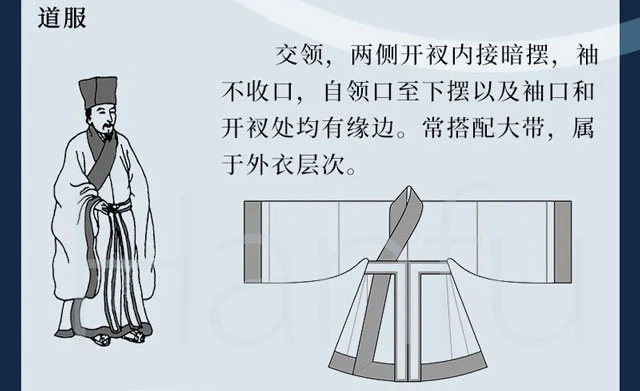Cross collar, upper and lower identity cut, continuous pleating of the lower garment, single side slit. It can be worn as an outer layer; it can also be worn as a shirt layer, with Daopao, Daofu, Zhishen, etc. Can be worn daily.