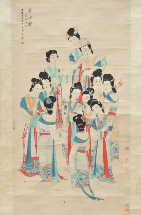 As the seasons change, each of the twelve months has a beauty representing the goddess of flowers. Zhang Daqian's "Twelve Months Flower Goddesses" scroll was created with this theme in mind, and is one of the finest of Zhang Daqian's paintings of ladies.