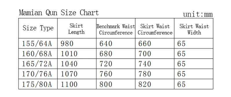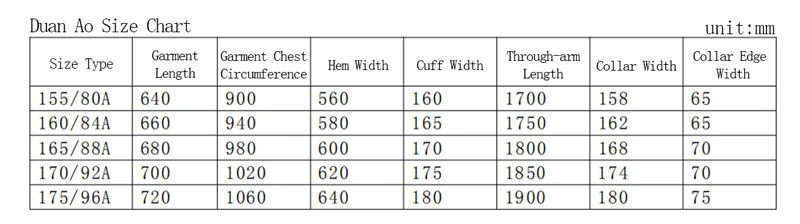 Size range: Duan Ao and Da Ao (155/80A to 175/96A), Mamian Qun (155/80A to 175/80A).