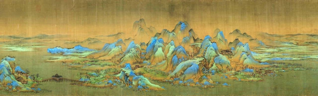 Wang Ximeng's "A Thousand Li of Rivers and Mountains," 51.5 cm wide and 1,191.5 cm long, is painting on silk in green and blue, lavish in its elegance, combining the majesty of a thousand miles of rivers and mountains with the smoky atmosphere of life.