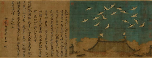 In 1112, on the 16th day of the first month(lunar calendar), the cranes hovered over the palace and refused to leave, so Emperor Huizong was excited to see this scene and considered it a good fortune for the prosperity of the country. So he painted this scene on silk, and inscribed a poem to record the fact.