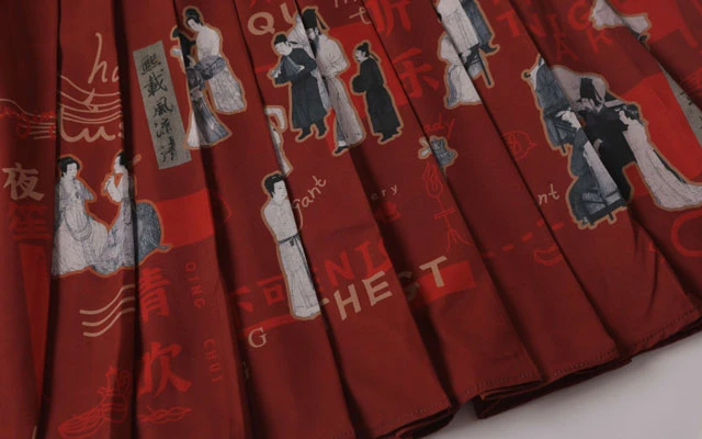 This hanfu inspired skirt takes part of the painting from each section of "The Night Revels of Han Xizai" and makes a bold secondary design attempt based on the original painting, fusing the elements from the painting into a modern skirt. The collision of traditional culture and modern design has revitalized the painting.