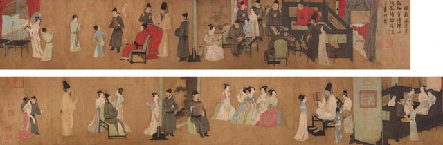 Depicting the scene of Han Xizai, an official, holding a night banquet at his home, with songs and music. There are five scenes in the scroll, and each scene is cleverly separated by a screen.
