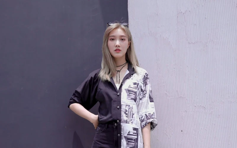 Shiyin chose to turn down the collar, one of the corners of the shirt tucked into the bottom, and the sleeves on both sides can be rolled up. Then, she paired it with denim shorts in the same color and a leather necklace.