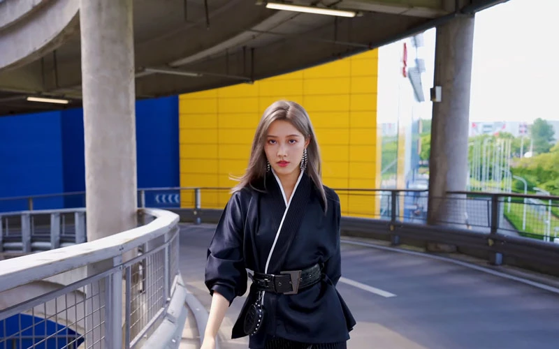 For the first set, Shiyin chose a Ming-style Duijin Duan Shan (lapel short shirts) with a very special color clashing design, which is perfect for a cool street style look even though it is a men's style.