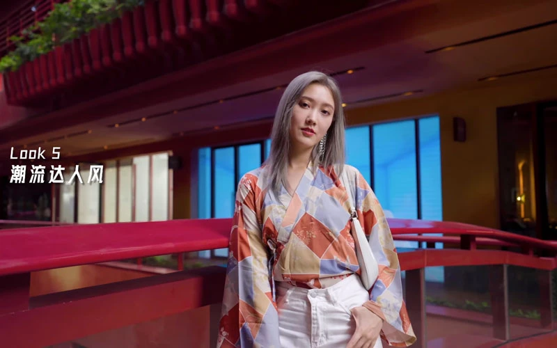 The fifth look starts with a cross-neck short shirt in a patchwork color that can be paired with a Song-style two-piece skirt. But Shiyin chose to pair it with white wide-leg jeans for an overall more casual and a bit more neutral look.