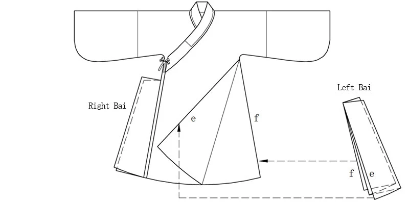 Note: The top edge f of the Bai is fixed to the dotted line shown by f on the body of the garment, not to the edge of a particular piece of fabric.