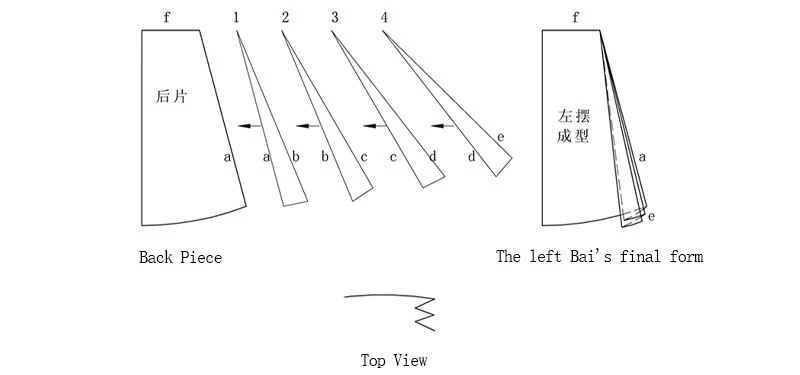 As shown below, the sides of the clothes are slit, the back edge of the back Bai (f) is sewn to the back piece of the clothes (f), and the front edge of the front Bai (e) is sewn to the front edge of the clothes (e), according to the arrow and the direction of the same letter, the edges of the same letter should be sewn together.