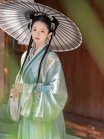 The first is the most characteristic "black and white ink color scheme", which is mostly used in hanfu that have an airy and fairy style, such as the long Beizi of the Song Dynasty or the stand collar Shan of the Ming Dynasty. The red color can be used in a large area in the Ji Fu (auspicious clothes). Cyan is very inclusive and can be used in a variety of hanfu styles.