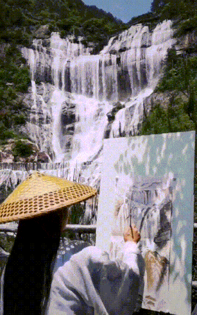 When the mood strikes, he will paint on the spot. At one time, it is not clear whether the person is painting or the person is in the painting.