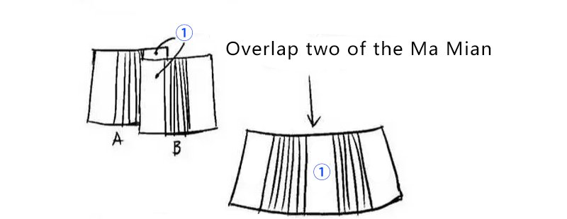 When put on, the ① of the pic is the overlapping part of the front. And the overlapping part at the back is other two Ma Mian. So, there are 4 Ma Mian in a Ma Mian skirt.