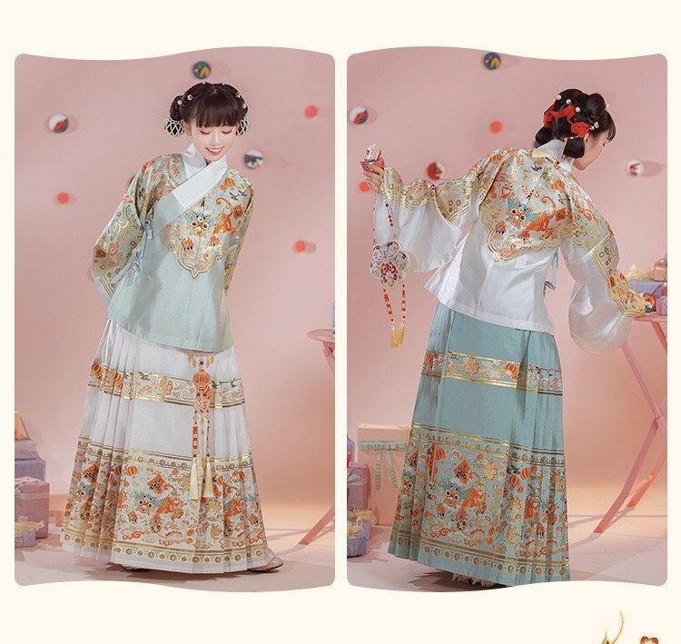 The upper Ao (袄) and lower skirts are typical collocations of women's clothing in the Ming Dynasty. A Ma Mian Qun or pleated skirt with Ao is called "Aoqun (袄裙, the name summed up by modern businesses.)".