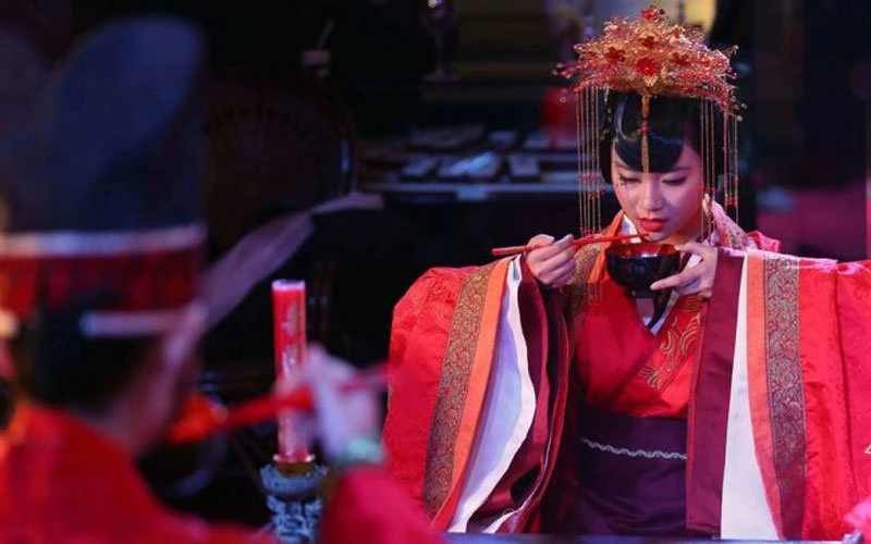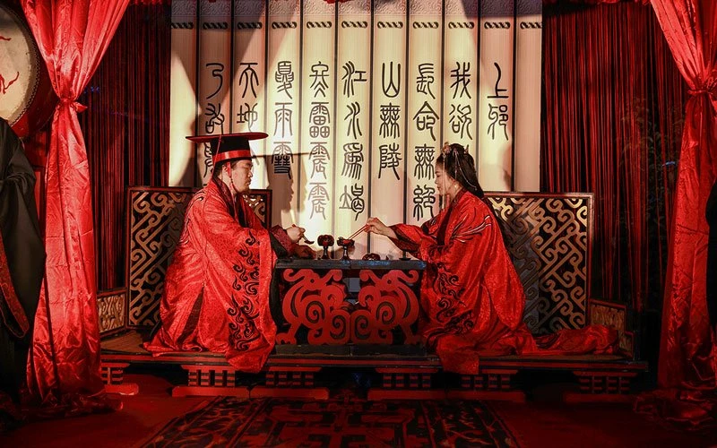 Formal wedding ceremony: Woguan (沃盥) →Duixi (对席) →Tonglao Hejin (同牢合卺) → Junyu Sheren (餕余设袵).