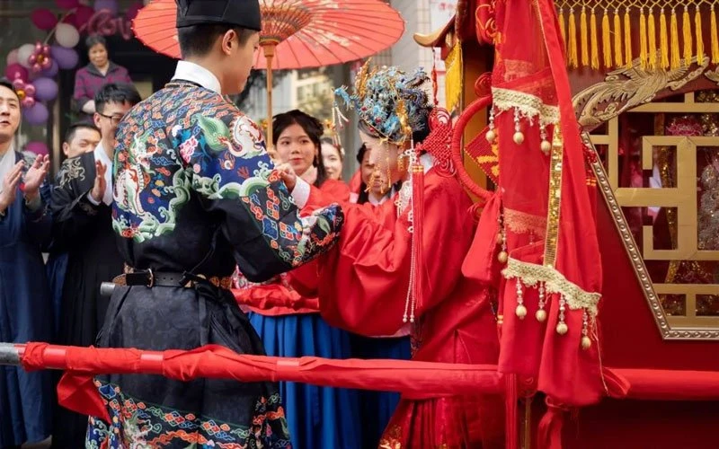 The Hanfu wedding ceremony of the Ming Dynasty mainly includes Nacai (纳采), worship heaven and earth, rough horseplay at weddings, feast, worship new parents the next day, etc.