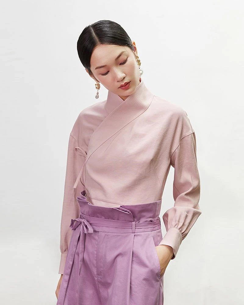 ▲The design of cross collar is not complicated, exquisite sleeve design, with wide leg pants, high waist pants are good choices.