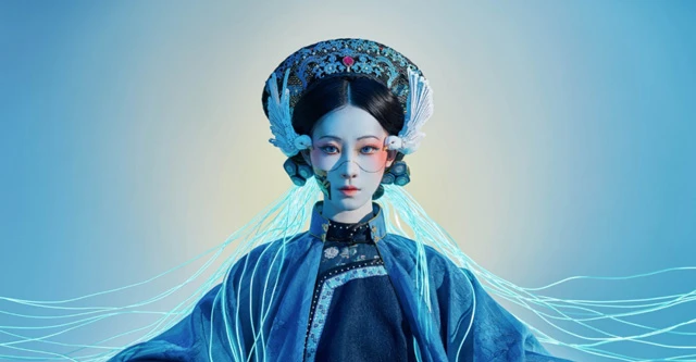 On top of that, this blogger combines traditional elements with cyberpunk style, combining ancient national treasures with futuristic science fiction, a cyan Qing costume, a beautiful Tian-tsui crown, and golden nail guards to show luxury!