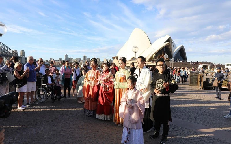 On September 30, 2019, a group of young people in Chinese costumes Hanfu came to the streets of Sydney Opera House with zither and pipa. They sang "my country and me" with music in foreign countries. According to @Ms. Tingyue, the initiator of the event, this is a Hanfu flash event in three landmarks in Sydney, aiming to promote traditional Chinese culture.