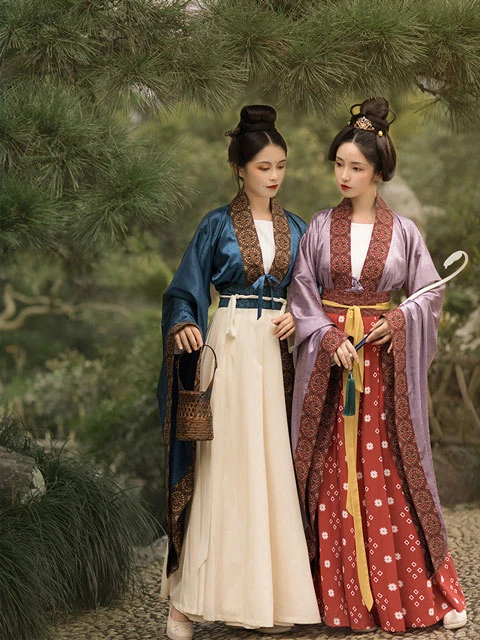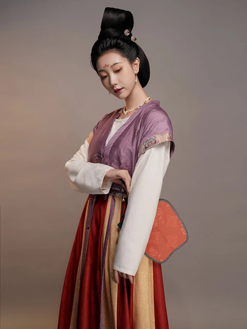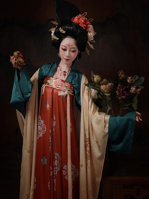 Tang Beizi and Po Qun incorporates elements of Hu clothing, so it always gives an exotic and unique feeling, but the overall floral pattern color scheme and other magnificence is reduced, and because its lower skirt is tied around the waist, it will look much thinner than Qixiong Shan.