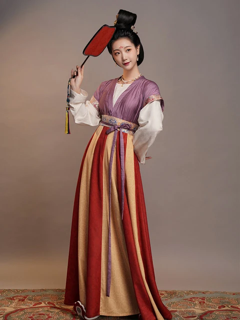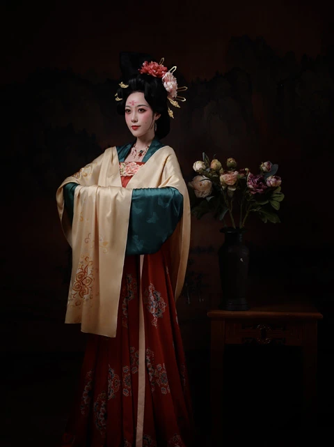 The shape of this hanfu is based on the restored fresco of "Donor portrait of Lady Wang from Taiyuan in worship", and its design style is exactly in accordance with the dressing style of people under the Tang Dynasty from the end of the Kaiyuan period to the Tianbao period, so its overall magnificent and colorful appearance reflects the open and open dressing culture of that time, and makes people look elegant and luxurious.