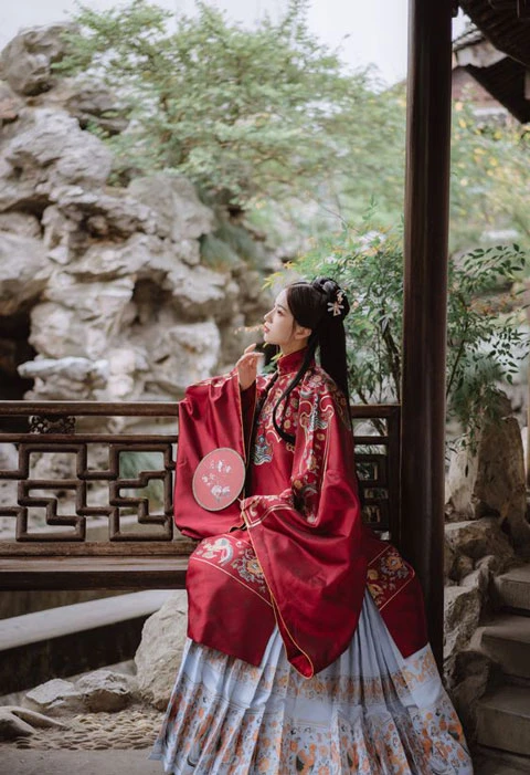 Unlike the waistline of the previous dynasties, which cinched the figure at either the waist or above the bust, Ming dynasty hanfu tends to follow the pattern of the aoqun, which combines a skirt (usually mamianqun) with a long top called the ao that goes straight down the body without being tucked inside the skirt. This kind of top can be long or short, and typically has pipa sleeves, sleeves in the shape of a kind of chinese lute called the pipa. It can be cross-collar, round-collar, or square-collar sometimes, and is typically either fastened at the shoulder or down the center.