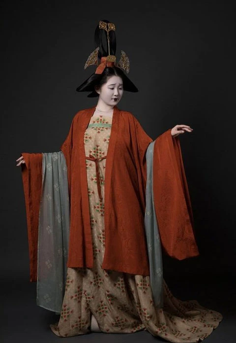 The qixiong style, with the skirt worn above the chest, became very popular with women during the Tang dynasty. Look for qixiong ruqun with flowy, ethereal fabric usually patterned with floral or geometric motifs and colored very vibrantly. Also look for the pibo, a long, elegant sort of shawl or scarf that women carried. They would trail behind them as they moved and offer an air of grace, emphasizing the flow of the fabric. Pibo can be worn around the elbows, over one shoulder, around the neck, and in many other ways.