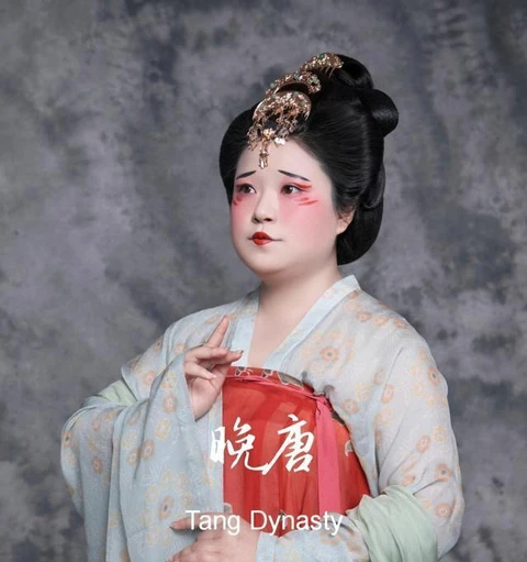 The makeup of the Tang prosperity period began to shift to a new style. There are two distinctive features, one is a more complex pattern of flower inlay, the second is the use of large areas of halo, especially the position of the cheeks, both sides of the cheeks red and shiny, such as the widely known wine halo makeup and sunset makeup.