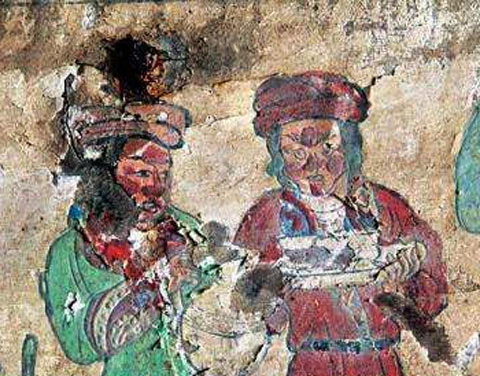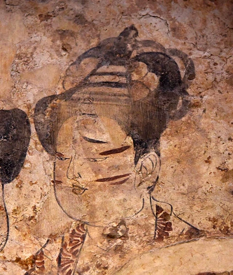In recent years, a large number of murals of figures have been unearthed in the tombs of Tibetan, and almost all of the figures are painted with various stripes, dots, and blocks of ochre color on the forehead, nose, chin, cheeks, and other parts of the face. Corresponding to the "Zhe Mian" in literature, showing its various painting methods.