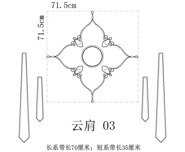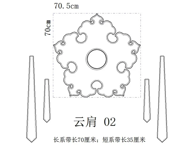 - If you want to add streamers. Sketch out the shape and length (design if you want to add them too). Trace it on the cloth of your choosing. Cut (tassels will need two layers of cloth sewn together). Sew the edges together. Flip it inside out so the sewing lines are hidden. Embroider the design if you have one. Close the end as well. And sew the end under the yunjian so the connected edges are hidden from visible eyes.