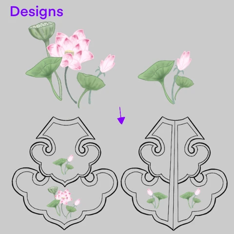Or buy water soluble embroidery films. You can transfer your sketch and lightly color onto the film (allows you to follow when you need to switch thread colors), and pin it on the area on the yunjian you want the design to be at. Then start sewing. Once done, the film will be hidden under the embroidery stitches, but you can remove the film by dipping it in water a few times without messing up the finished embroderies too badly.