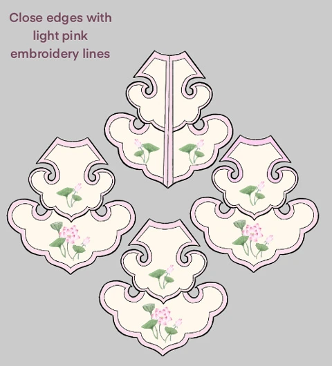 Now you’re almost finished with your yunjian. Now it’s all on the design embroideries. When you transfer the cut-out to cloth, you may or may not sketch out the design shape as well. If you didn’t you can just do another cut-out of only the design and trace it on the half-finished yunjian.
