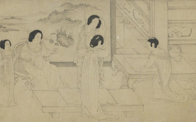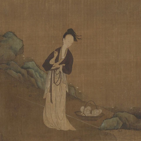 Xi Shi washing the silk yarn at the stream, painting by Zhou Wenju of Five Dynasties and Ten Kingdoms period