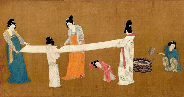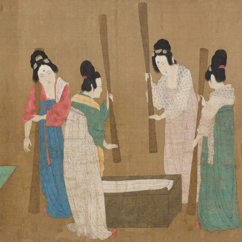 Zhang Xuan's "Court Ladies Preparing Newly Woven Silk" visually recreates the scene of a woman ironing clothes during the Tang dynasty: two women hold one end of the silk in each hand, while another woman, holding an ancient iron in her right hand, concentrating on ironing back and forth on the silk.