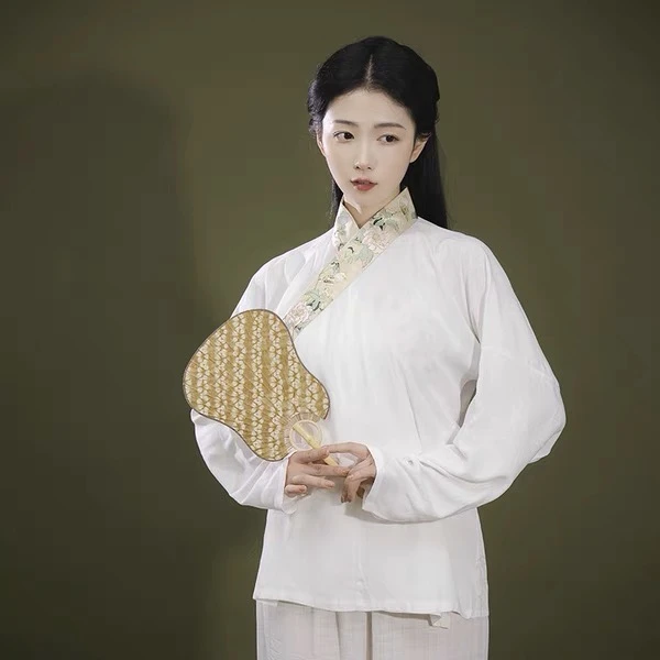 The name airplane sleeves is obviously something that we came up with recently, but it’s what’s used to refer to this kind of narrow sleeve popular in the Song dynasty with a very clear narrowing from the shoulder to the wrist, named because laid flat, the shape made by the shape of the sleeves represents two airplane wings. Usually used in a second or third layer of a womens’ Song dynasty set with a straight parallel collar, these kinds of sleeves are very easy to recognize and typically run very wide and loose on the arms.