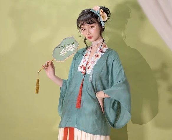 Less of a collar type and more of a way to wear a collar, the cross-worn collar is when you take a parallel or straight collar and cross it in an X over the front of your body, imitating the jiaoling style, and keep it in place by tying the skirt over the bottom of the top. Some hanfu in this style also come with ties to keep it in place. This one is usually seen in Song dynasty women's clothing and results in a very low cross-collar look further down on the torso, usually only used in outer layers.