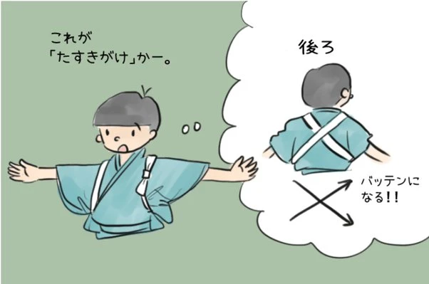- Later, if the sleeves fall out from the tasuki, you can just gather the sleeves up again and slip it back between the tasuki and arm.