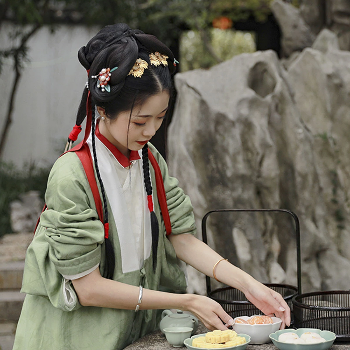 There is little informations that discussed the history of panbo besides saying that it is something invented during the Song Dynasty to bring conveniency. Perhaps the few dynasties after Song also integrated this into their outfits when needed. Even now, people interested in hanfu culture might still use panbo when the long sleeves of their hanfu is getting in the way.