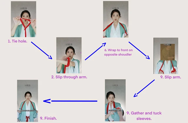 As for the panbo’s tying techniques, people can only based it off the artworks they’ve unearthed. Perhaps there is more than one tying methods, or perhaps there is only one. Even if there is supposed to be one original method, people now have expanded from that one to many more. Afterall, there are no strict rules like hanfu outfits for panbo that draws distinction between the nobles and commoners, or what type of clothing needed to be worn at particular situations. It is simply a tool used mostly by working people who need to earn their income by moving a lot and getting many tasks done daily. So even if there are different tying techniques, as long as it can secure the sleeves up when working, then there doesn't have to be an argument over what is the right and wrong way.
