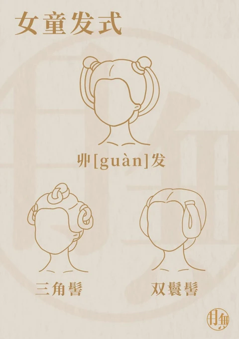 The hairstyle of girls who have not yet reached adulthood does not vary much, but is mostly "Guan Fa (丱发, guàn fà)" or a draped bun around the ears.